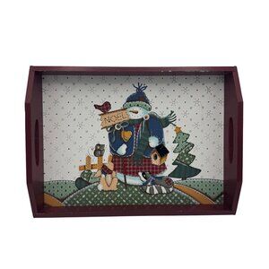 This decorative serving tray features a delightful snowman holding a "Noel" sign, surrounded by festive elements like a birdhouse and tree. Its rich burgundy frame with convenient handles makes it both functional and visually appealing for holiday entertaining.