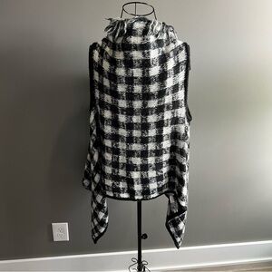 Super soft knit vest with black and white pattern. Features fringe accents. Ideal for layering.