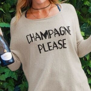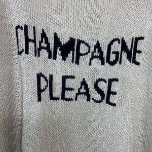 A cozy-meets-chic statement knit from Wooden Ships that pairs playful personality with luxe craftsmanship. Made from a premium mohair, wool, and acrylic blend, this beige crewneck is tissue-soft and lightweight, featuring “Champagne Please” in bold black lettering. The open crew neckline flatters, while its slightly boxy, relaxed fit and fitted sleeves make it a versatile layer for elevated casual looks or festive nights out.