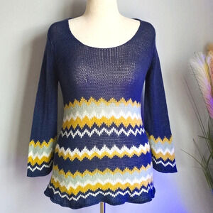 Wooden Ships, Navy Blue Yellow Chevron Stripe Scoop Neck Sweater, Size Medium