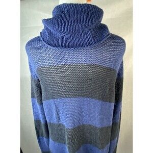 Wooden Ships Paola Buendia Open Knit Cowl Neck Sweater in cool tone Blue Gray Stripes, has side vents. In size M/L, please see measurements below. Has stretch. In excellent preowned condition!