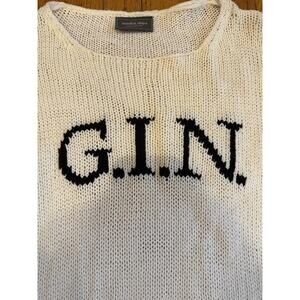 Item: Women's open knit pullover sweater with front "G.I.N." graphic