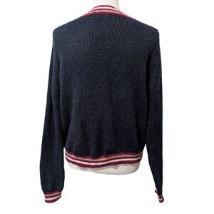 Good condition, has some minor wear, pilling/fuzzing, no rips, holes or tears, nice blue w/red, white stripe collar/waist and cuffs, lightweight and relaxed, acrylic/mohair/wool blend, not perfect, but really cute