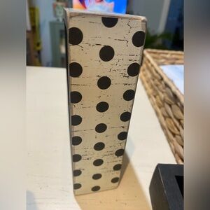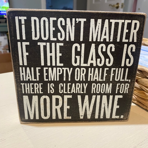 Rustic wooden block sign featuring a humorous wine quote in bold white lettering on a black background. Ready to display on a shelf or counter. Simple farmhouse style. Great for kitchen or bar decor.