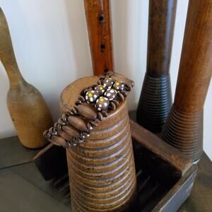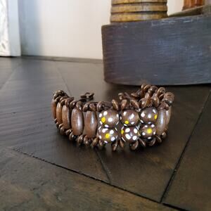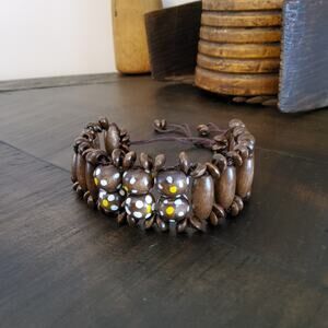 Grab this brown yellow and white dot wooden stacked slide bead bracelet now.