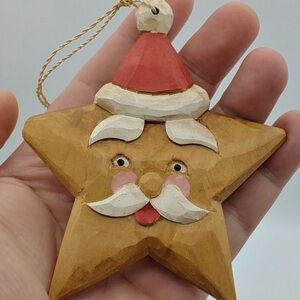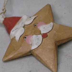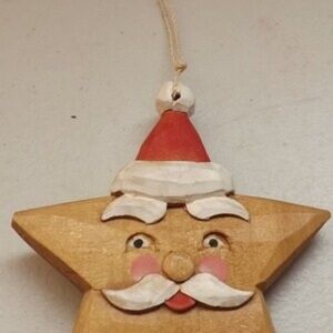 Charming wooden star ornament with Santa face. Features a red hat and white beard. Perfect for holiday decor.