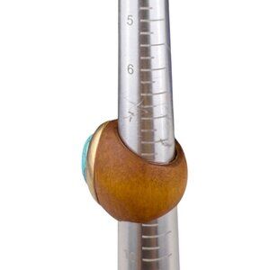 This exquisite vintage wooden ring exhibits both earthy charm and timeless craftsmanship. Created with a smooth, warm brown wood base, it showcases the natural grain and texture of the material. A striking turquoise accent stone is securely nestled within a golden-tone metal setting, enhancing the rustic-meets-refined aesthetic. The natural veins in the turquoise add depth and character, reflecting its organic origins.Sized at approximately 7, the ring offers a substantial profile without being overpowering. Its solid wooden shank is contoured for comfort, while the artistic combination of materials evokes a bohemian, folk-inspired appeal. Perfect as a bold accessory, this piece seamlessly transitions from casual to statement-worthy. Durable and rich in texture, it carries the enduring charm of handcrafted artistry.