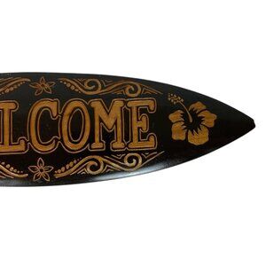 Handmade wooden surfboard sign with "Welcome" design and tropical hibiscus motif. Adds a coastal charm to decor, ideal for entryways or beach houses.
