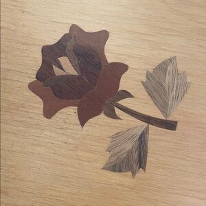 Elegant wooden tray featuring a rose inlay design. Perfect for serving or decor.