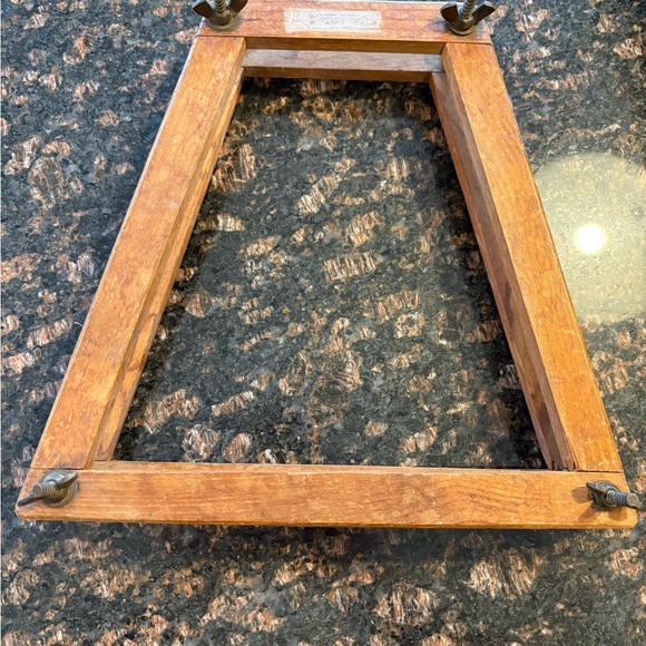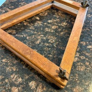 Unique antique wooden tennis racket press. Perfect for displaying art or photos. Features a natural wood finish.