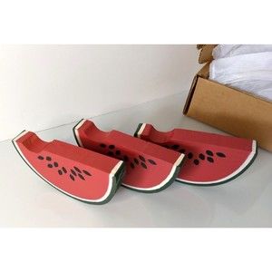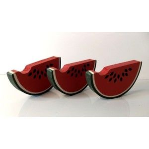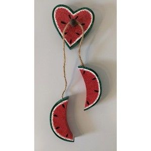 Brand new wooden Watermelon hanging wall decor - 3 watermelon slices can hang on wall or sit on shelf plus two wooden watermelon slices joined by twine hanging from heart-shaped watermelon slice. These three watermelon slices all measure 2 5/8"H x 4 1/2"W each and have sawtooth hangers.