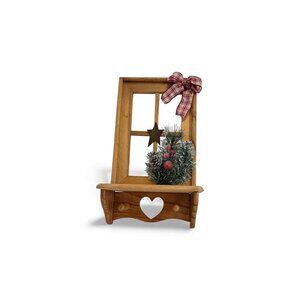 This wooden shelf adds rustic charm and holiday spirit to your space. It features a heart cutout, plaid bow, and frosted greenery.