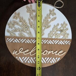 Round wooden welcome sign featuring a floral design. Perfect for your front door or entryway.