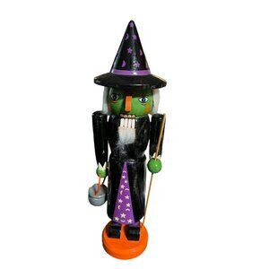 Add a whimsical touch to your Halloween decorations with this wooden witch nutcracker. Standing at 14 inches, it features a hand-painted design with a starry hat and a broomstick, making it a delightful festive accent for any home.