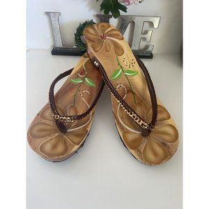 Boho Unique Wooden Women's Thong Sequined Tropical Floral Hand Painted Sandals Size L/9 Vintage. fits up to 3.5" Wide feet at widest part. Pre Owned but Unworn. Soles have marks in the wood not do to wearing. Very Pretty and surprisingly Comfortable! Please See all Pictures.