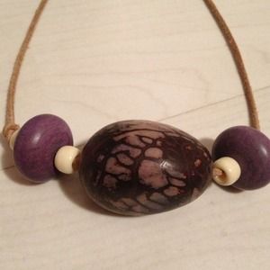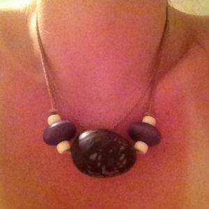 Never worn. Given as a gift. 3 large purple beads separated by white beads. Lies on collar bone.