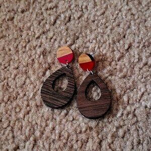 wooden earrings handmade. with red resin down at the bottom!