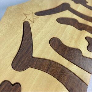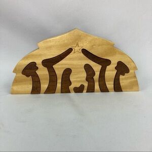 This is a beautifully handmade nativity puzzle decor piece. Great for the holiday season. Two different wood stains give a beautiful contrast to a minimalist interior design. Mother Mary Joseph baby Jesus two trees the star and the stable.