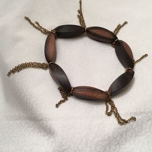 This beautiful bracelet consist of oblong faceted dark wooden links and goldtone spacers with dangle chains. It is elasticized so will fit through an 8” wrist. $8 each or bundle 3 of same price for $15 and save.