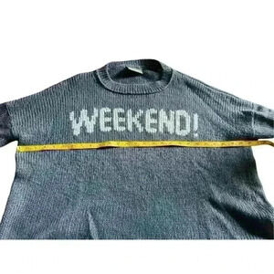 This is your weekend sweater !! Made by woodenships this blue weekend sweater is sold out everywhere. It was worn once please review all the photos. It has a little bit of piling on one of the sleeves but nothing you can shave off or pull. It is all black with a Weekend logo across the chest.