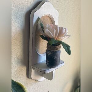 Wood wall hanging decor. White distressed. Comes with flower and jar shown. Farmhouse with burlap accent. Ships next day. I have another one slightly different also, be sure to check it out!