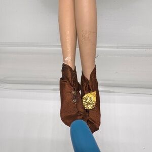 CONDITION: pre-owned, good condition overall - the top of her dress came unglued to her, one of her legs broke but is taped and covered mostly by her shorts under dress, one of her boots is missing the design