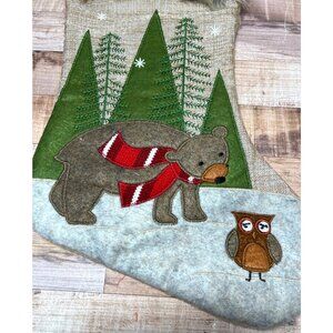 A professionally crafted holiday stocking featuring an intricate woodland scene with an adorable bear and owl. The design showcases detailed embroidery of evergreen trees against a textured burlap background, complemented by a plush fur trim for an elegant seasonal decor piece. 19'' x 11''