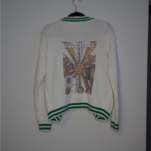 Woodstock Rhinestone White and Green Sweater Cardigan with Graphic Design