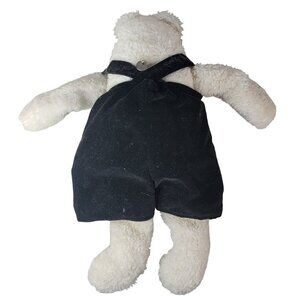 Woof & Poof White Polar Bear Plush Shelf Sitter Black Velvet Nose Ears Shorts Shortalls Vintage. This charming plush bear, dressed in luxurious black velvet overalls with gold button accents, is a timeless collectible and a cuddly companion.