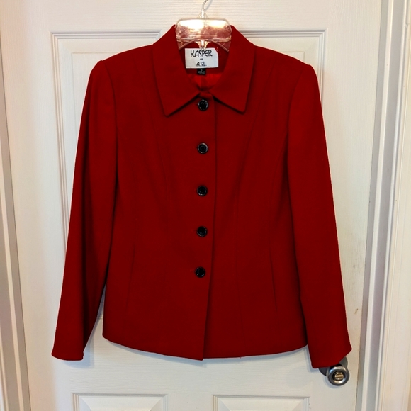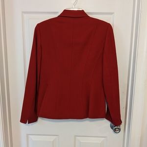 Kasper brand red blazer style jacket. Has small holes in the outer layer on the right sleeve, pictured. Size 6. Outer shell is 100% wool, lining is 100% polyester. Very warm!