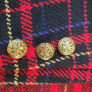 Stunning fully lined wool blend Blazer. Frint pockets, ornate button closure, three button cuffs. Very good pre-owned condition. Pit to pit 20" shoulder to hem 29".