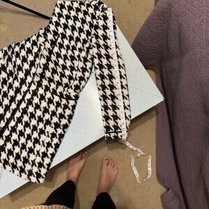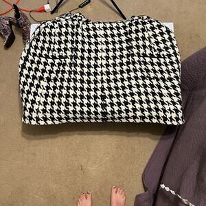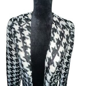 Perfect for any occasion, this coat offers both style and comfort. The hounds to woven design wraps, seamlessly around the entire coat, including pockets. Classic piece for business professional or capsule wardrobe. Simple black ribbon, accent down front of coat and on pockets. Gentle wear. I would keep it but it’s too small for me now. Lining is in great condition.