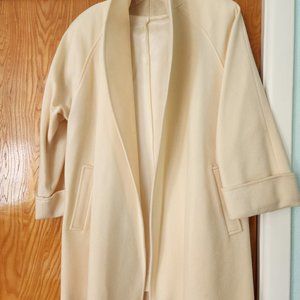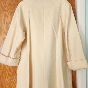 Cream color, light wool blend, fully lined oversized swing coat. Full sleeve length 26", folded 23". Shoulder to hem length 33", armpit to armpit 21". Size S - M.