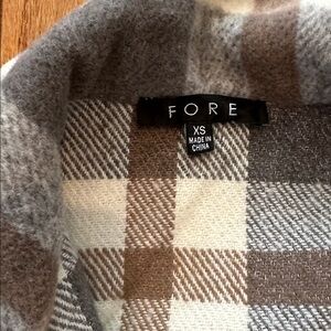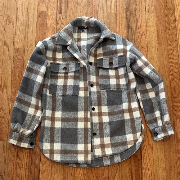 Stylish plaid button-up shirt in gray and brown. Features front pockets and button closure.
