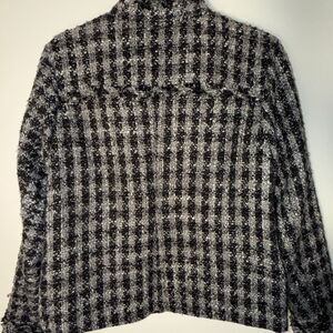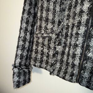 Chic, elegant, and perfect for cold-weather layering, this wool-blend textured tweed jacket features a rich black-and-gray boucle weave with subtle fringe details that elevate the classic silhouette. A stylish blend of timeless tailoring and modern edge. Frayed fringe edges along seams