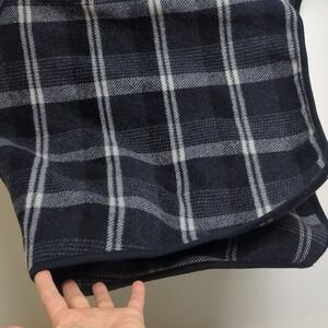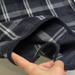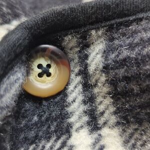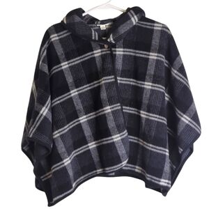 One button Poncho in a plaid wool blend with black edging. Perfect for fall and winter!!