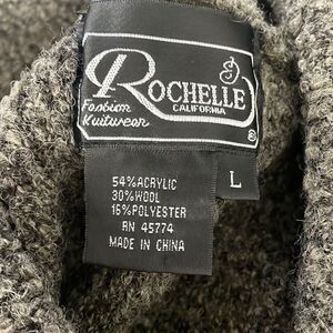 Rochelle California Dark Taupe Wool Boucle Knit Button Front Sweater Vest sz L. Features warm and cozy taupe/dark brown wool blend knit (54% Acrylic, 30% Wool, 16% Polyester), fully functional button front, front slip style hip pockets, foldable mandarine collar, white knit stripe around armholes, pockets & hemline. Gently worn and hand washed with some light pilling but no flaws to note. A great wardrobe add if you love the cozy grandpa sweater layered looks!