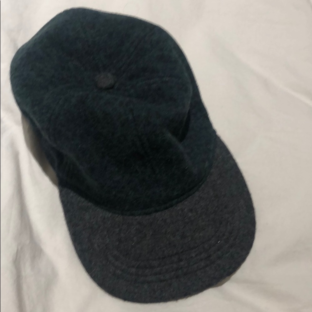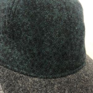 Lightly printed, wool, hunter green top and grey brim, baseball cap. Genie by Eugene Kim.