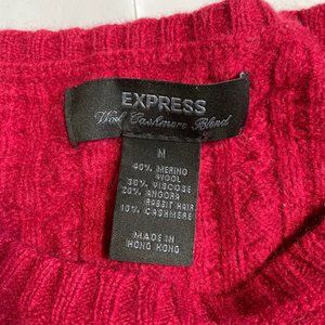 Women's Express burgundy red wool, angora, viscose, and cashmere blend cable knit sweater. One small spot on the back - it's very subtle because it's kind of hidden under one of the 3D cable knit sections and the sweater is a pretty dark color. Otherwise excellent condition.