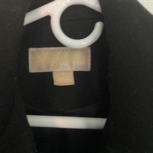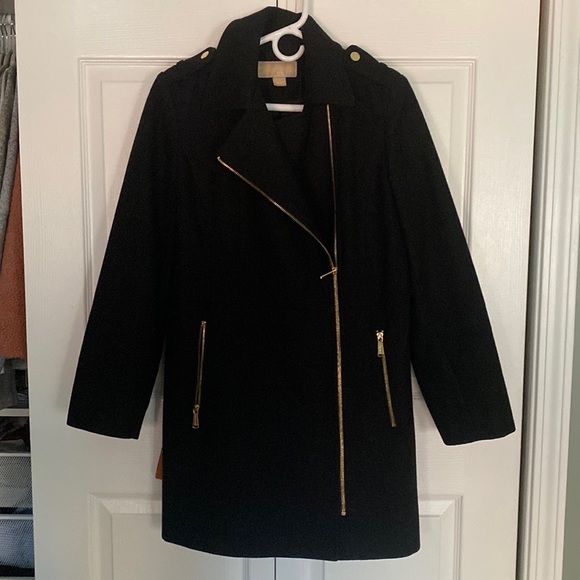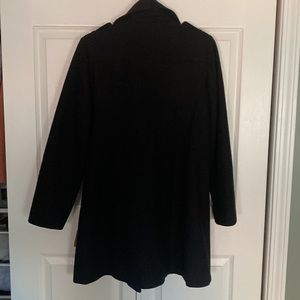 Good used condition off center gold zipper black wool dress coat. Hits just below knees on 5’5”.