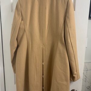 Fully lined wool coat has silver buttons for closure.Also,silver buttons in the back of the coat that can be opened for a slit.There's an inside pocket as well as 2 side pockets.Come from a smoke free home.