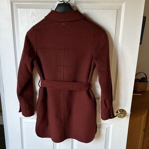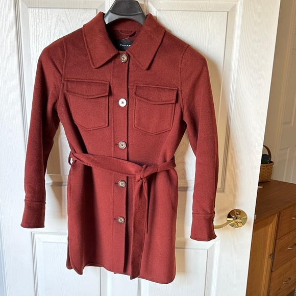 Chic utility jacket with a belted waist. Features a warm rust color and buttoned front. Total of four pockets. 54% wool so it's warm but not too warm. Color is rust and not as red as the photo