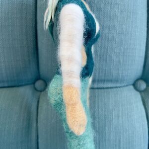 Needle Felted Wool Doll Trendy Old Woman Art Piece Display. Handmade, one of a kind, trendy clothes and dyed hair style. She is subtly poseable, but does not stand on her own (she is propped on couch for pictures). 13" tall.