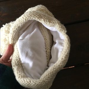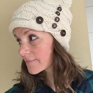 100% wool hat, with cozy strip of fleece on inside for comfort. Really warm and fashionable with decorative brown buttons.