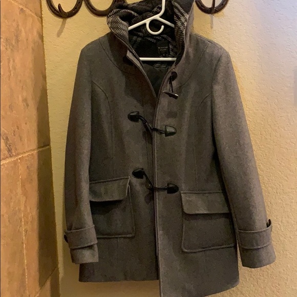 Super cute grey wool, lined coat. With good, zipper and toggle closures.