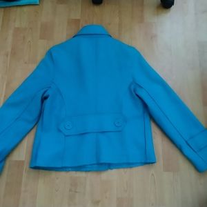Turquoise blue Paris blues jacket. Large button closure. Slight purposeful fraying on bottom. Good used condition. Needs to be cleaned, it is dry clean only. Minor discoloration on arm from being sun bleached shown in last picture.