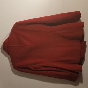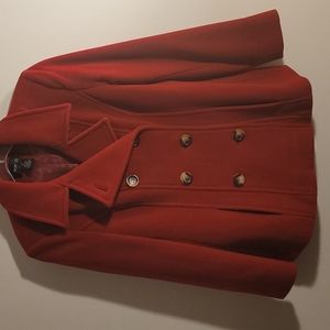 Deep burgundy wool petite medium jacket. Brown buttons. Poly lining.