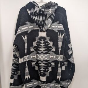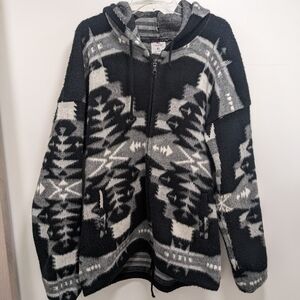 Wool jacket, with a hood, front zipper, and ties at the bottom to cinch.