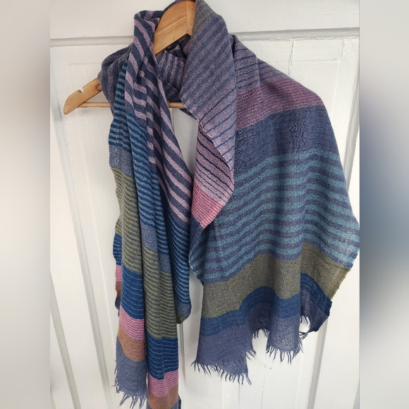 Stylish scarf with blue, pink, and green stripes. nice and warm without having the bulk and irritating feeling of some winter wool scarves. has a very elegant drape. perfect finishing touch to your winter ensemble. approx 5'×2'