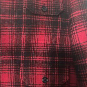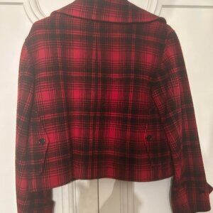 This is a very beautiful black and red wool Ralph Lauren Rugby plaid jacket. Definitely an eye catching piece in winter. The buttons are hidden below the flap. There are four pocket on the front and two on the side/back. Padded on the inside, it is in perfect condition, rarely worn, and perfect for the winter with layerings or on chilly spring or fall. It fits for size Small or X small ladies.